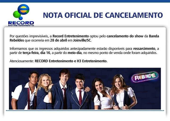 Isso Mesmo! os Show dos Rebeldes que iam acontecer em Florianópolis(27/04) e Joinville(28/04), foram cancelados pela Record Entretenimento a notícia foi postada pelo diretor de eventos de Florianópolis Hermann Motta no twitter e Rodrigo Schneider de Joinville no facebook. os motivos não foram ditos mais a parti desta próxima terça-feira(16) estarão disponiveis o ressarcimento nos mesmo pontos de vendas que os ingressos foram adiquiridos.